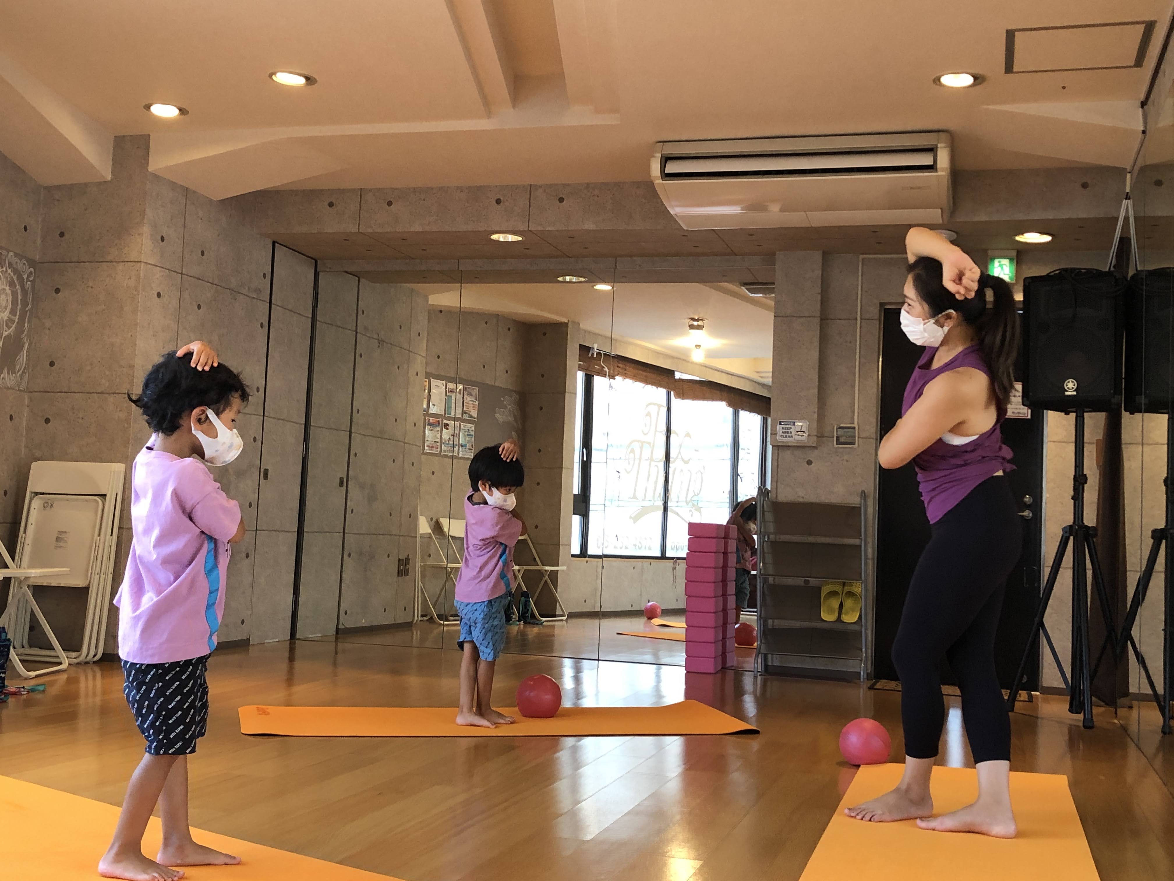 身体をいっぱい使い子どもも楽しい様々なヨガポーズをとり普段使わない神経や筋肉を動かし、